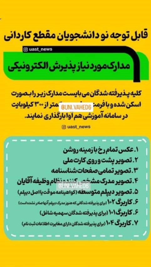 اخبار مدارک لازم برای نودانشجویان مقطع کاردانی مدارک مورد نیاز برای دانشجویان نوورود مقطع کاردانی ۳ آبان ۱۴۰۴ ۰۸:۵۳ تعداد کلیک : ۱۹ نظرات بینندگان میانگین امتیاز کاربران: 0.0 (0 رای) 12345 امتیاز 12345 برای امتیاز باید عدد وارد کنید نام فرستنده نام را وارد کنید پست الکترونیک پست الکترونیک صحیح نیست پست الکترونیک نمایش داده شود. نظر نظر خود را وارد کنید تعداد کاراکتر باقیمانده: 500 پس از انتشار این نظر، به من اطلاع داده شود.
