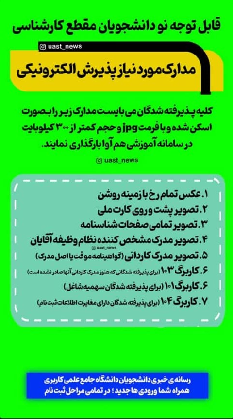 اخبار مدارک لازم برای نودانشجویان مقطع کارشناسی برای دریافت رسید تحصیلی مقطع کاردانی از روشهای زیر اقدام قرمایید ۳ آبان ۱۴۰۴ ۰۸:۵۳ تعداد کلیک : ۱۷ نظرات بینندگان میانگین امتیاز کاربران: 0.0 (0 رای) 12345 امتیاز 12345 برای امتیاز باید عدد وارد کنید نام فرستنده نام را وارد کنید پست الکترونیک پست الکترونیک صحیح نیست پست الکترونیک نمایش داده شود. نظر نظر خود را وارد کنید تعداد کاراکتر باقیمانده: 500 پس از انتشار این نظر، به من اطلاع داده شود.